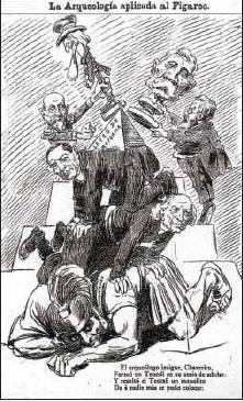 In December 1904, El Colmillo Público published a cartoon which spoofs the liberal conception of history. It shows Cuauhtémoc at the base of a human pyramid with Hidalgo and Juárez stacked at higher levels, and pokes fun at the porfirista Alfredo Chavero, who is seen struggling to set a bust of Díaz on the pinnacle of the structure, while general Bernardo Reyes tries to cap it with a figure of Uncle Sam. (Fulton; 2008a, nota 84)